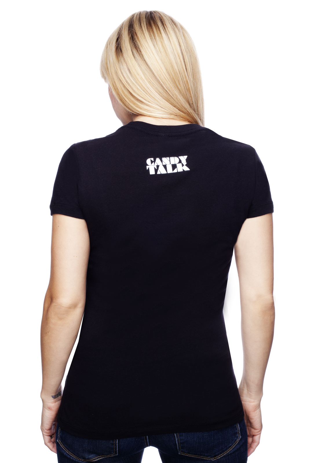 Rami is wearing the Candy Talk cat logo t-shirt.