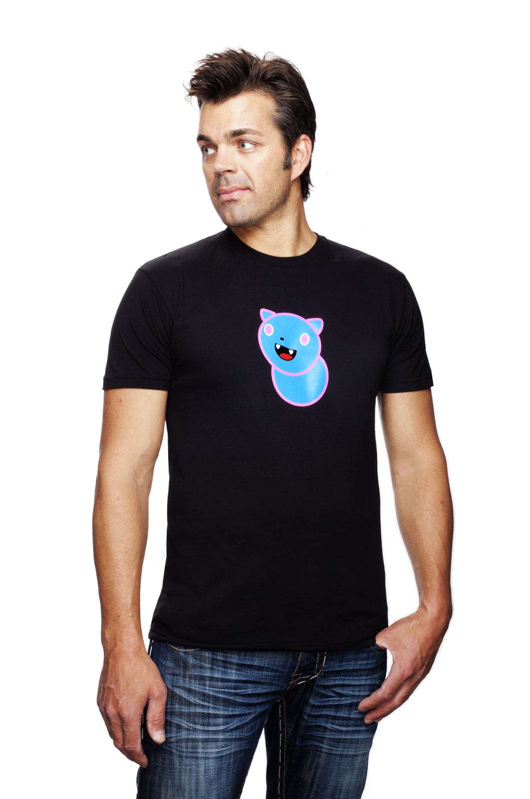 Harry is wearing the Candy Talk cat logo t-shirt.